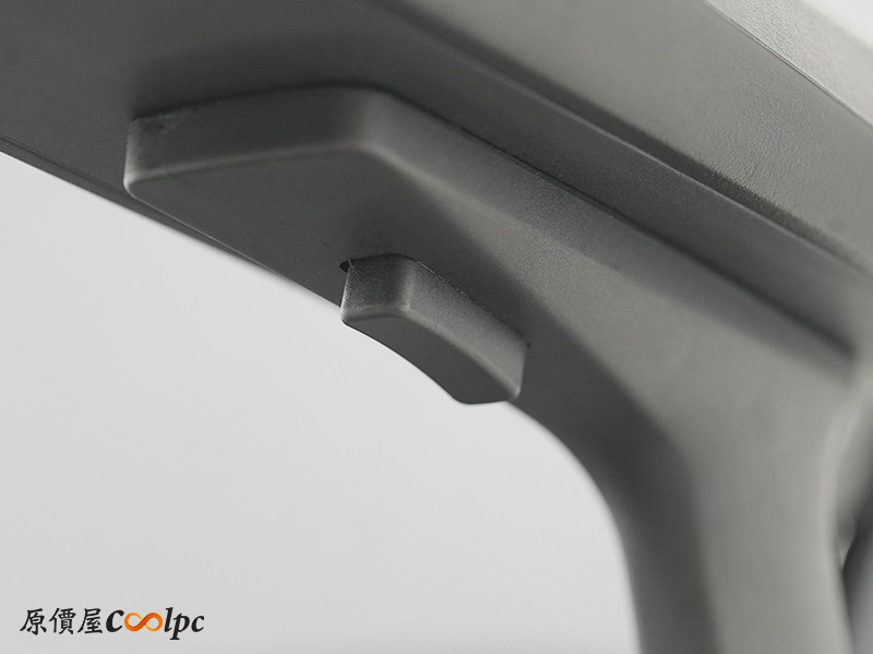 左右扶手也是符合人體工學,扶手表面左右高起,更貼近手臂的形狀,而且調整高低的按鈕在下方,這點倒是挺特別。