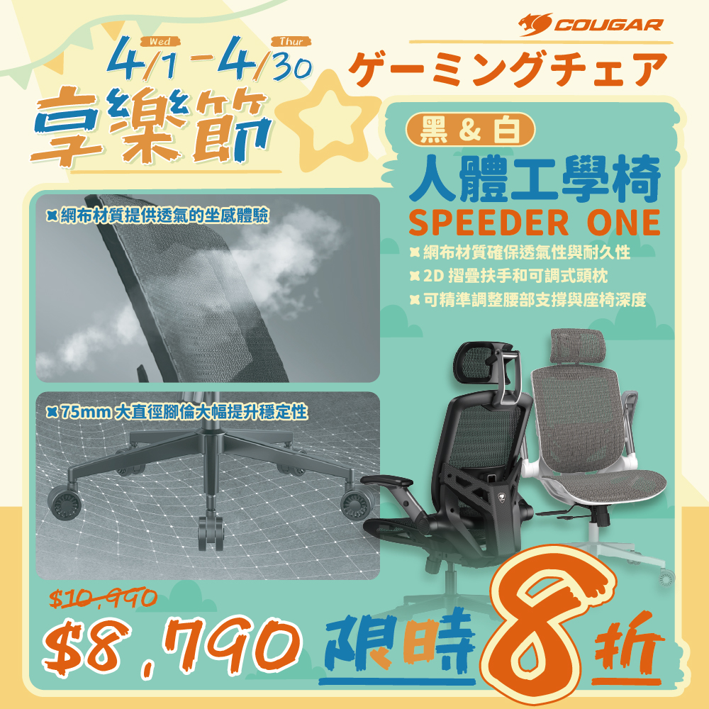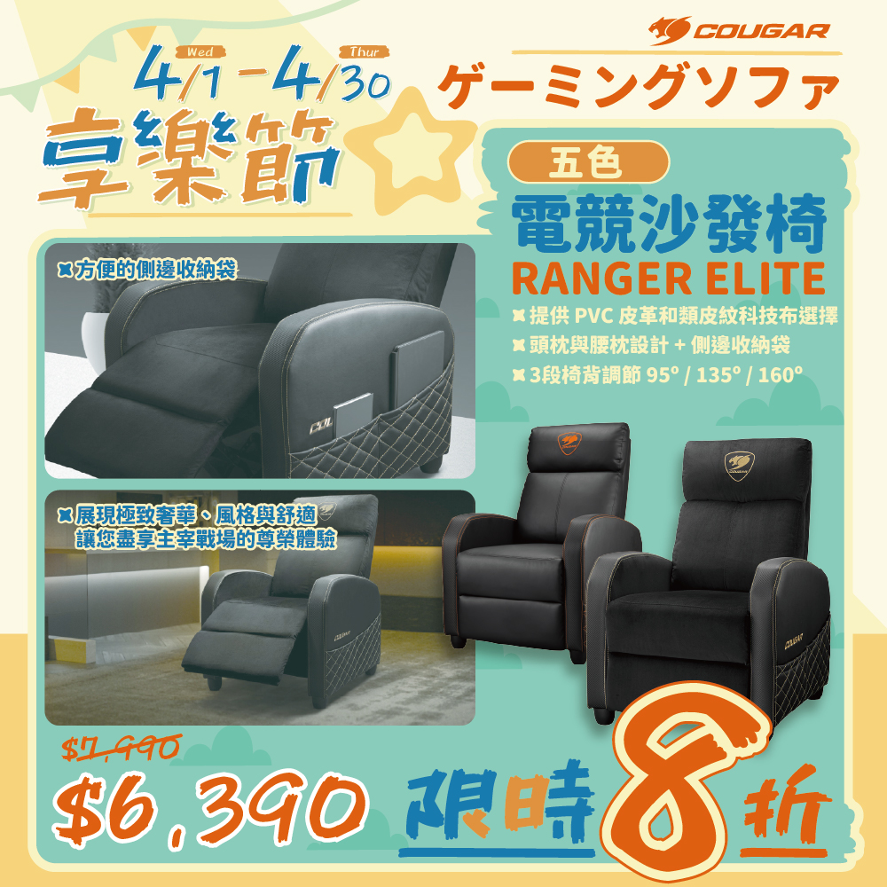 這次優惠的COUGAR美洲獅電競家具選擇可多了,電競椅、人體工學椅、電競沙發椅、電競桌品項加起來快要20種!其中電競椅就是COUGAR DEFENSOR系列,招牌的PushBack高級腰部支撐系統彈性調整下背支撐,搭配4D可調摺疊扶手提供靈活使用空間,面料還有編織布、仿亞麻布、Hyper-Dura高級皮革版本可選。如果是怕熱或需要長時間坐著的人,COUGAR SPEEDER ONE的透氣網布椅面更適合你,不僅通風良好防止悶熱,精心設計的椅面曲線分散身體壓力,頭枕、扶手、腰靠、座椅全方位調整也帶來更好的支撐性。而最舒服就是COUGAR RANGER ELITE系列電競沙發,能坐能躺搭配腳靠設計,全身都能真正放鬆,還提供柔軟的天鵝絨、PVC皮革、類皮紋科技布等面料選擇,享受舒適、時尚、奢華等多種體驗。最後還有坐站皆宜的COUGAR E-STAR電動升降桌,適合預防久坐傷害、注重健康的玩家,電動升降調整到適合自己的高度,站著使用促進血液循環,姿勢不正和代謝下降的風險排除了,還具備耐用的仿碳纖維桌面、防潑水全桌鼠墊、螢幕增高支架、耳機掛架等配置,桌面尺寸有140、120cm可選。現在通通八折優惠,快來一套購入改變你的居家遊戲生活吧。