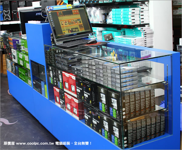 入口右邊櫃台,華碩、技嘉、微星、華擎、精英主機板在後面陳列架上,櫃內則滿是記憶體與SSD。