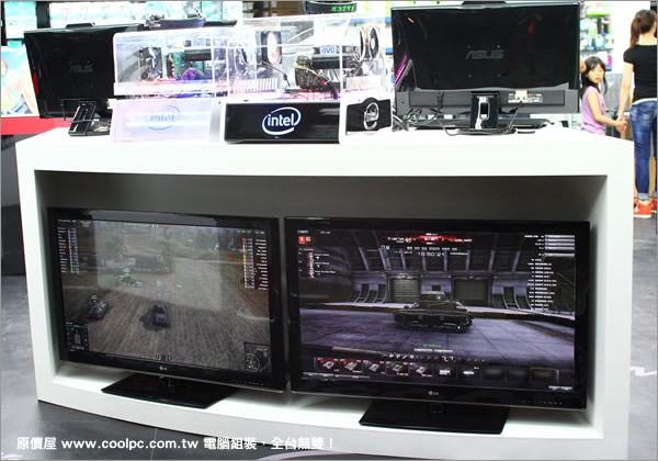 大門口電競遊戲區後方有個展台,為大家擺出來幾部液晶顯示器, 其下櫃內則有散熱器、音效卡與行車紀錄器。