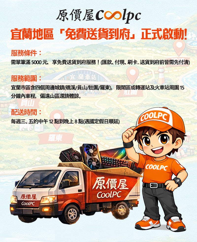 想像一下,在家滑滑手機、選好電腦零件或周邊設備,下一步不是出門排隊,而是等它自己送上門來!沒有錯,原價屋要在「宜蘭地區」直接升級服務啦~推出超佛心的「免費送貨到府」服務!重點是真的免費喔~這項服務專為宜蘭地區打造,涵蓋宜蘭市區,以及礁溪、員山、壯圍、羅東等周邊區域,只要在市區鬧區、轉運站或火車站周邊 15 分鐘車程內,大多都能送得到。當然偏遠山區就先跟大家說聲抱歉啦~司機大哥也是要顧安全的(笑)。配送時間也很剛好,每週三、五中午 12 點到晚上 8 點(國定假日順延),讓你下單後不用等太久,下班或吃飯前就能迎接新裝備。不管你是升級電腦、補齊配件,還是想衝一波電競設備,現在通通更輕鬆!享有此服務的方式也很簡單,只要單筆滿額 5000 元即可享有免費送貨到府服務。付款方式不拘,匯款、現金、刷卡通通都 OK,只要配送前完成付款,就能坐等原價屋幫你送到家門口!對於不想搬重物、或想省時間的人來說,這服務真的超加分的啦!
