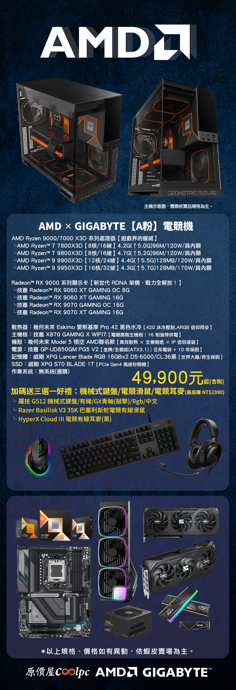 AMD x GIGABYTE【A粉】電競主機我們選用 AMD Ryzen™ 9000X3D 或 7800X3D 最強遊戲處理器為核心,不僅征服 AAA 遊戲大作,多核性能更上一層樓,蘇媽圈粉全憑實力!整套硬體還搭配技嘉 X870 GAMING X WIFI7 主機板,16+2+2 相強悍供電 + 全金屬護甲超硬派規格,再配上技嘉 Radeon™ RX 9000 系列顯示卡,RDNA 4 架構、第三代光線追蹤 + FSR 4 超解析,與 X3D CPU 完美契合!電源供應器選用技嘉 GP-UD850GM PG5 V2 金牌全模組(ATX3.1),日系電容 + 10 年保固,穩壓輸出超穩定!威剛 XPG Lancer Blade RGB 16GBx2 DDR5-6000 + 威剛 XPG S70 BLADE 1T SSD,開機秒入戰場零延遲,高頻率 + 高速讀寫,創作遊戲雙飛!Eskimo 愛斯基摩 Pro 42 水冷就厲害了,420mm 冰冷壓制 + ARGB 同步,確保 CPU 性能 100% 發揮!最終將這些性能野獸裝進幾何未來 Model 5 悟空 AMD 聯名款機殼,高效散熱 + 全景側透 + AMD 風格設計,完美擄獲粉絲的芳心!順道提醒,加購 Windows 11 享原價屋終身免費安裝(詳情)!更簡單一點的說,組裝有原價屋完美交機把關(詳情),搭購系統原價屋幫您裝,收到主機後盡情玩,壞了我們 cover!