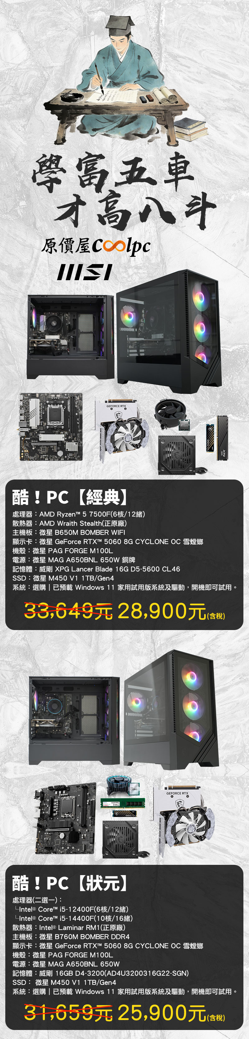 酷!PC【狀元】主機以萬人之上之姿橫掃戰場後,熱銷的盛況反映出各位對極致 C/P 值的渴望,原價屋決定延續這股不敗氣勢,讓酷!PC【狀元】主機強勢歸位,並同步推出新世代悍將酷!PC【經典】主機聯手出擊!如果說【狀元】是運籌帷幄、實力奪魁的統帥,那麼【經典】就是學富五車、更顯貴氣的經典文魁。Intel 與 AMD 兩大陣容全面補齊,無論您是要在遊戲戰場橫掃千軍,還是追求 AI 運算的黑科技加速,這裡都有您的專屬配備,讓您在電競與創作的江湖中,始終立於不敗之地!