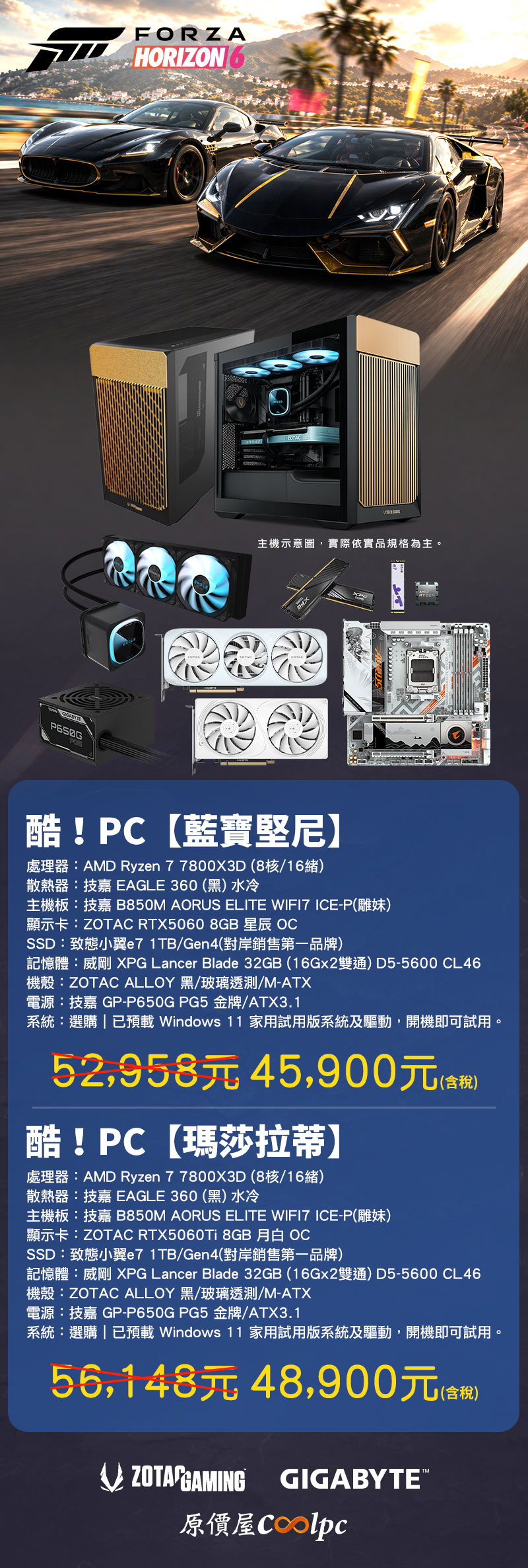 上週酷!PC【法拉利】【保時捷】的白色風暴席捲全台,一度熱銷到應接不暇,老司機們敲碗追加款式的訊息直接塞爆小編私訊!各位的聲音我們聽到了,這回火速追加兩輛黑色超跑-酷!PC【藍寶堅尼】【瑪莎拉蒂】霸氣進站!同樣秉持「老司機買貴包退」的絕對霸道,內在搭載遊戲玩家心目中的神級處理器 AMD Ryzen 7 7800X3D,並依性能需求分別匹配 RTX 5060 / 5060 Ti 戰力,外在換上深邃冷酷的 ZOTAC ALLOY 黑色玻璃機殼,內外兼修。兩款主機合計限量僅 250 台。面對市場漲價潮,原價屋依舊展現誠意,幫大家扛下預算漲幅,且讓您在 5/19《極限競速 地平線6》上市前,提前整裝到位。錯過第一波的朋友,這次請直接油門一敗,別再看著別人的車尾燈嘆氣啦!